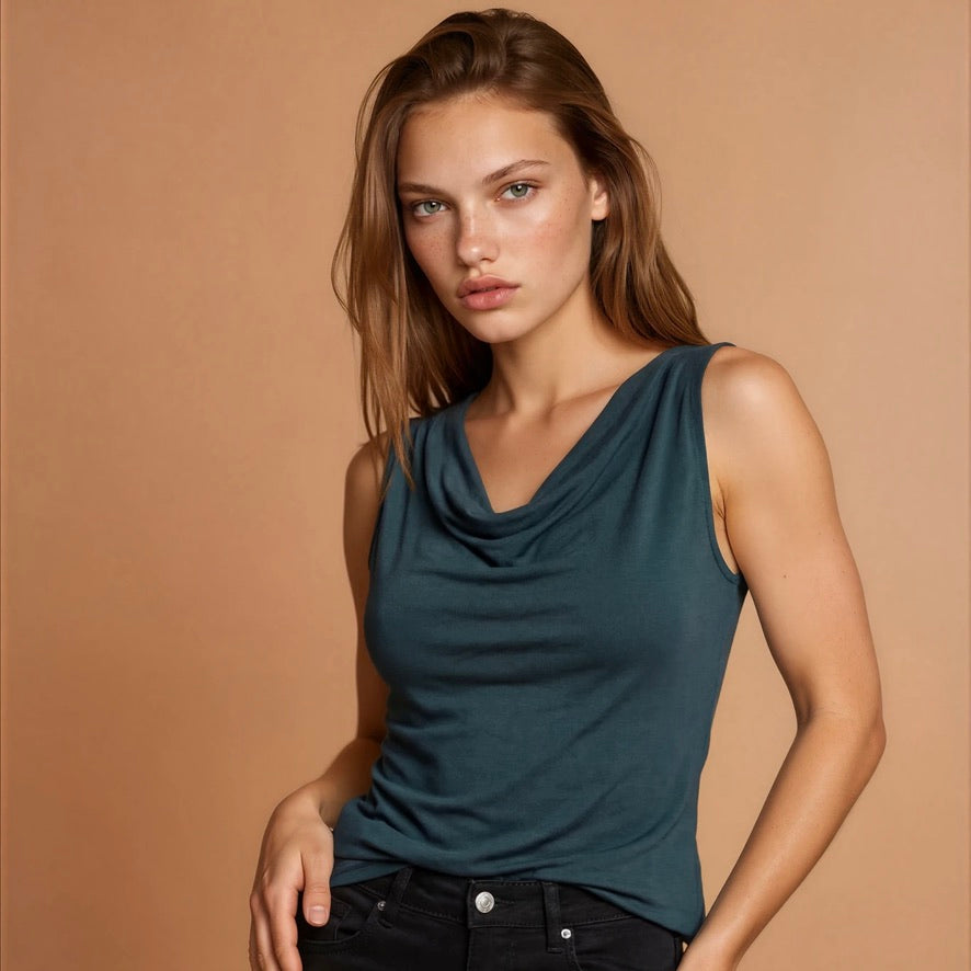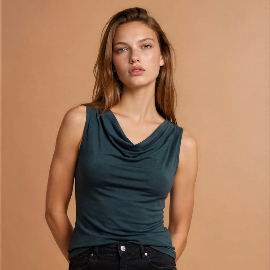 The Victoria top wins hearts with its figure-flattering cut and timelessly feminine waterfall collar , which can be worn both in the front and back. The back features a narrow, rounded V-neck. The fabric lies a hand's width across the shoulders, concealing bra straps.
