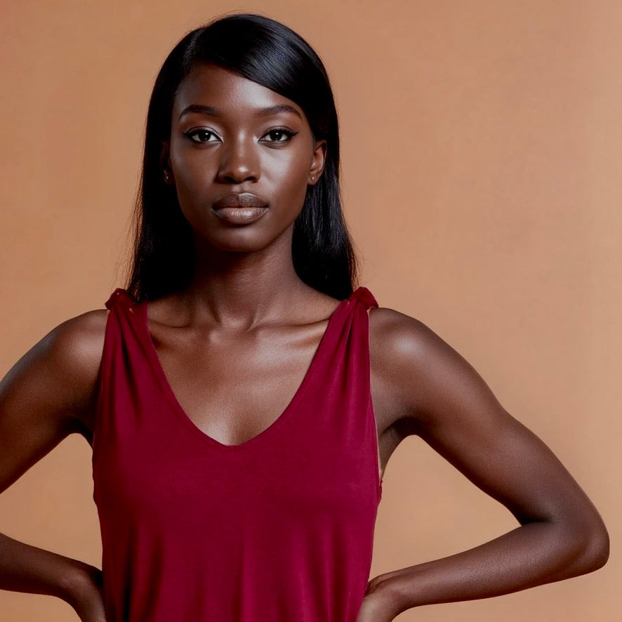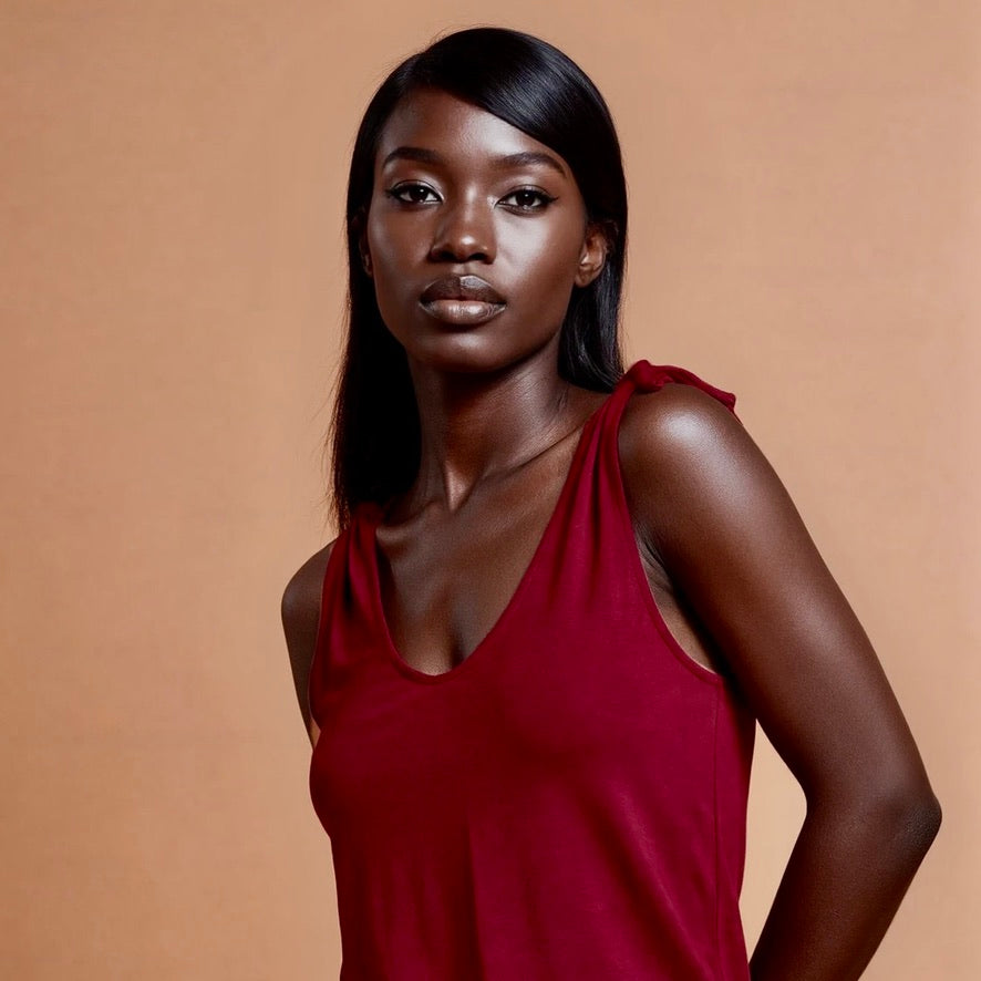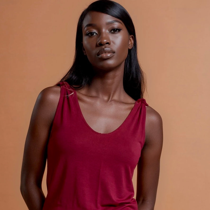 The straps are open at the top and can be tied with a knot or bow at the shoulder, back, and front. The tying alone offers at least four different ways to wear it. Add to that the fact that the gathered section can also be worn on four different sides, and it becomes clear why this versatile top is a favorite for long summer nights!