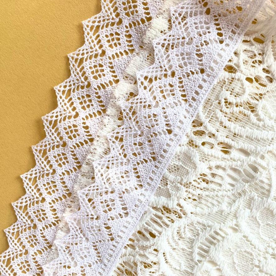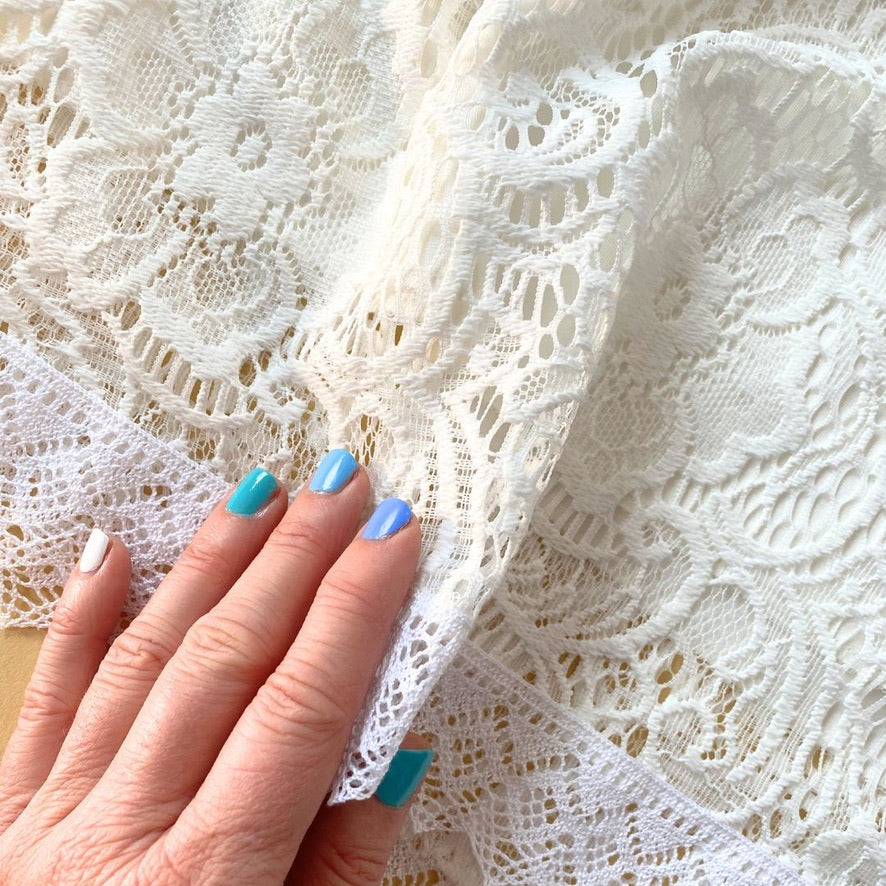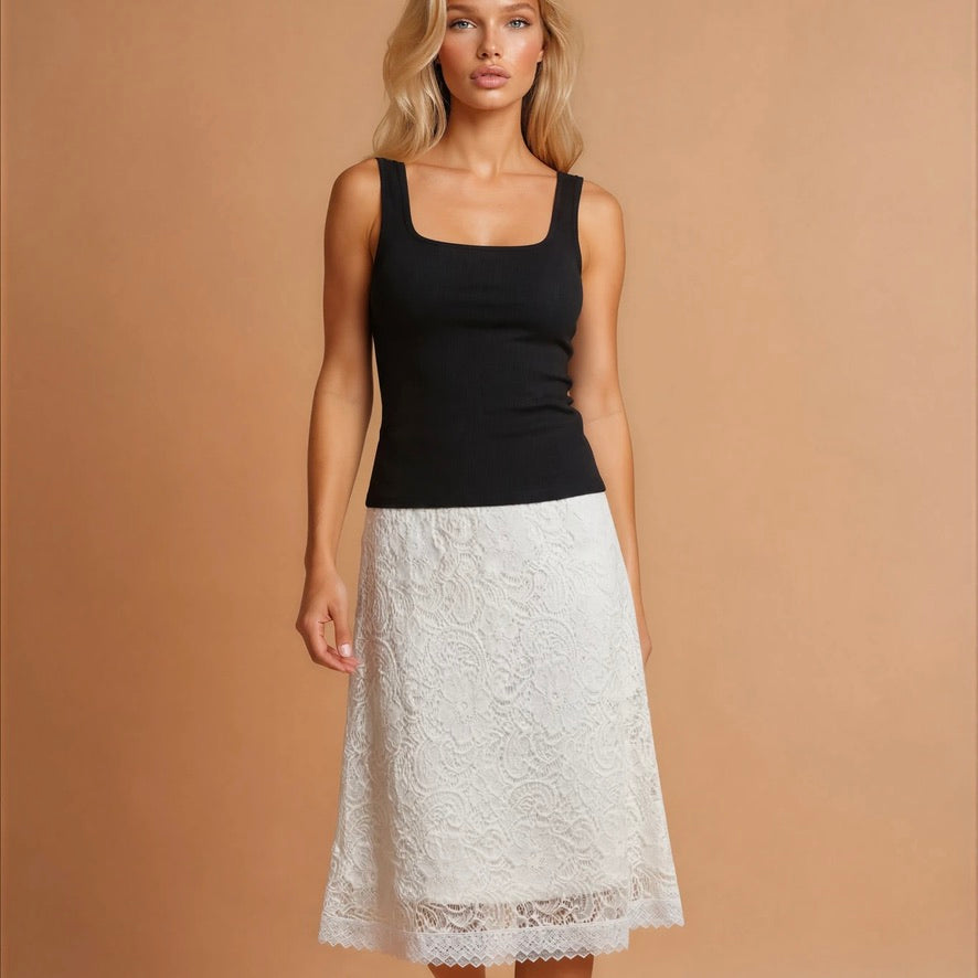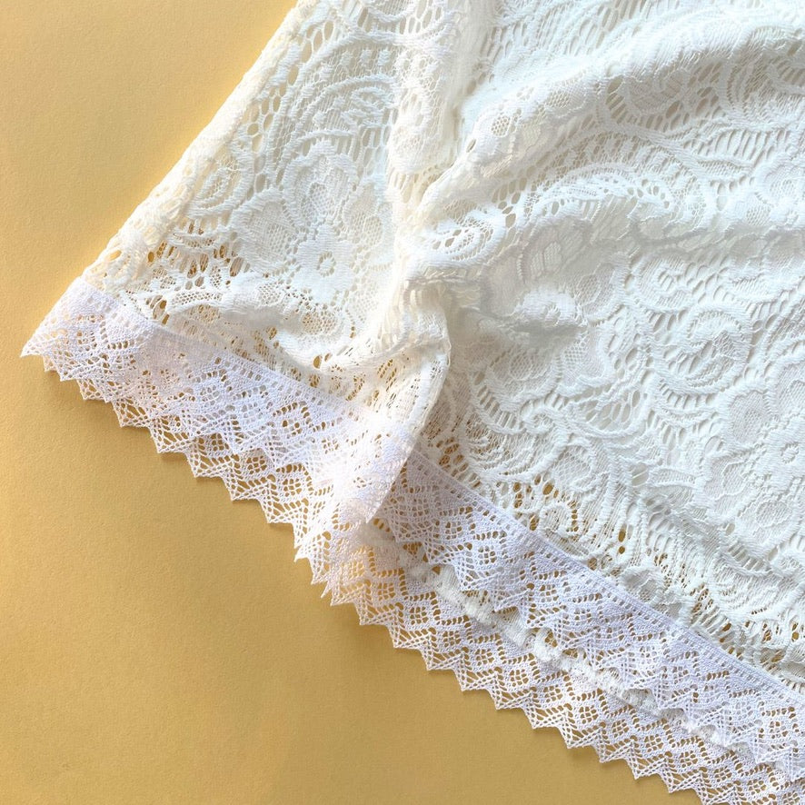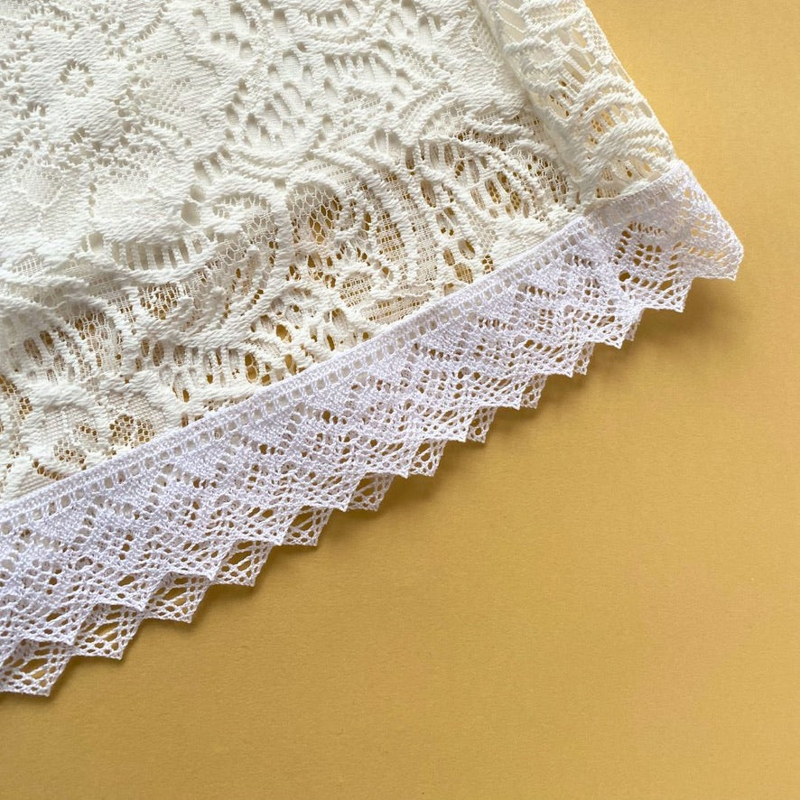 Eine großzügige Lage weißer Spitze mit elegantem Blumenmuster liegt über einem cremeweißen Unterrock. Das Weiß der Spitze leuchtet zart gegen das warme Cremeweiß des Rocks – ein Detail, das Tiefe und Charakter gibt.