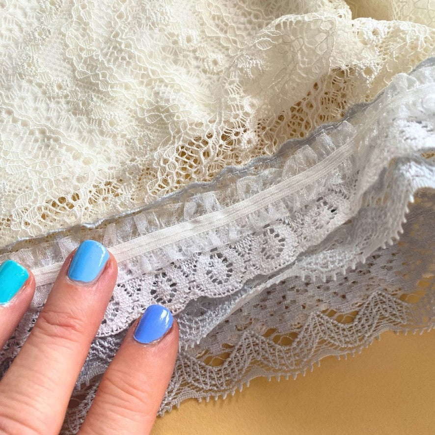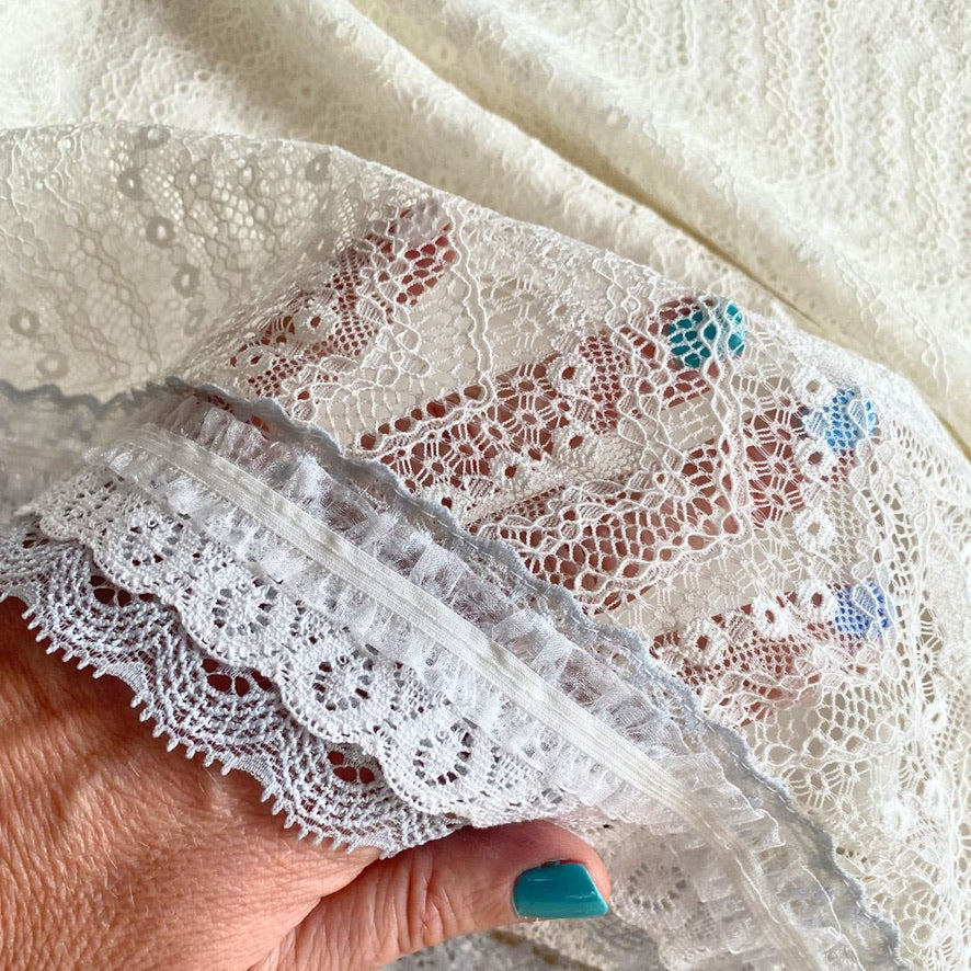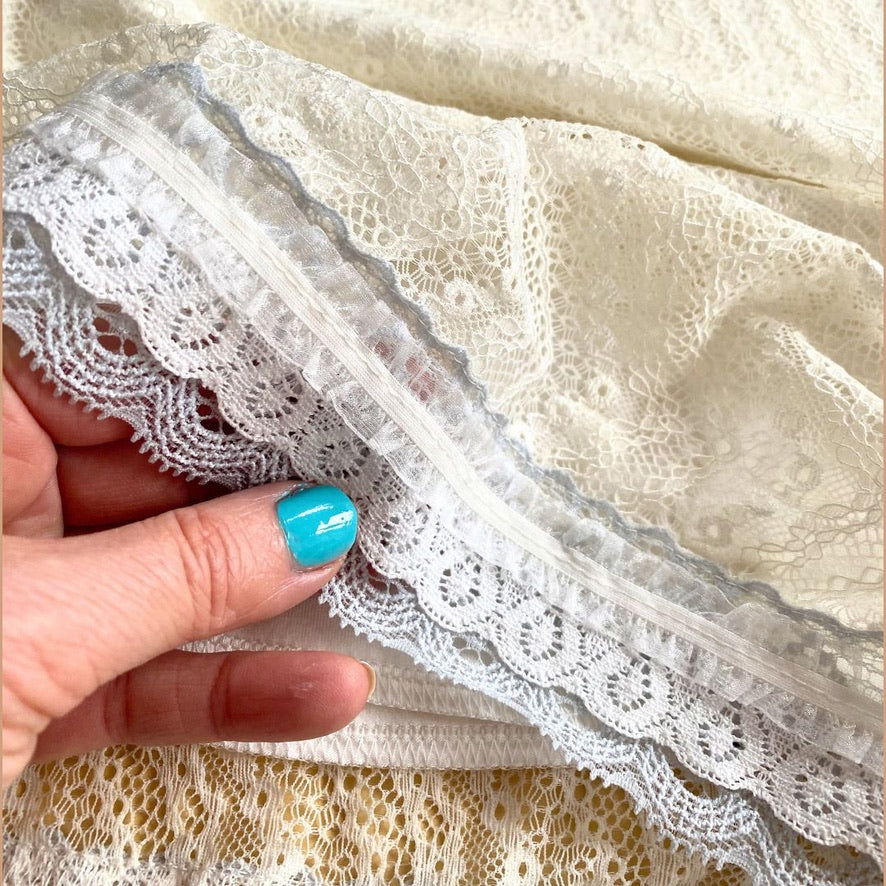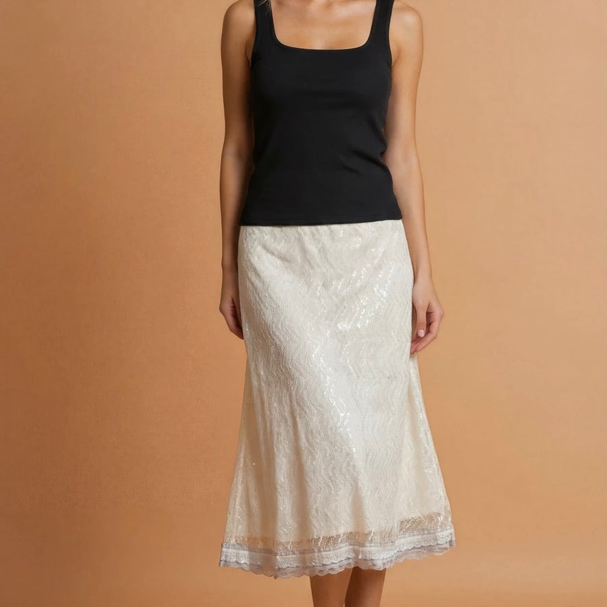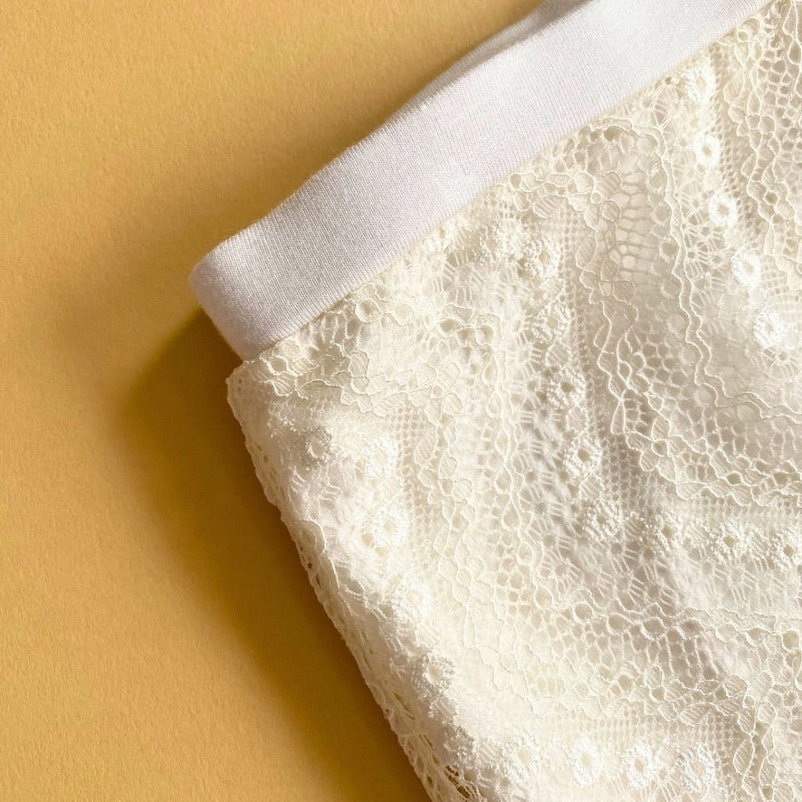 Eine Lage feiner Spitze in warmem Cremeweiß liegt über einem weichen Jerseyunterrock und schafft so die perfekte Kombination aus Struktur und Leichtigkeit. Er schmiegt sich an, ohne einzuengen – und bewegt sich mit dir, nicht gegen dich.