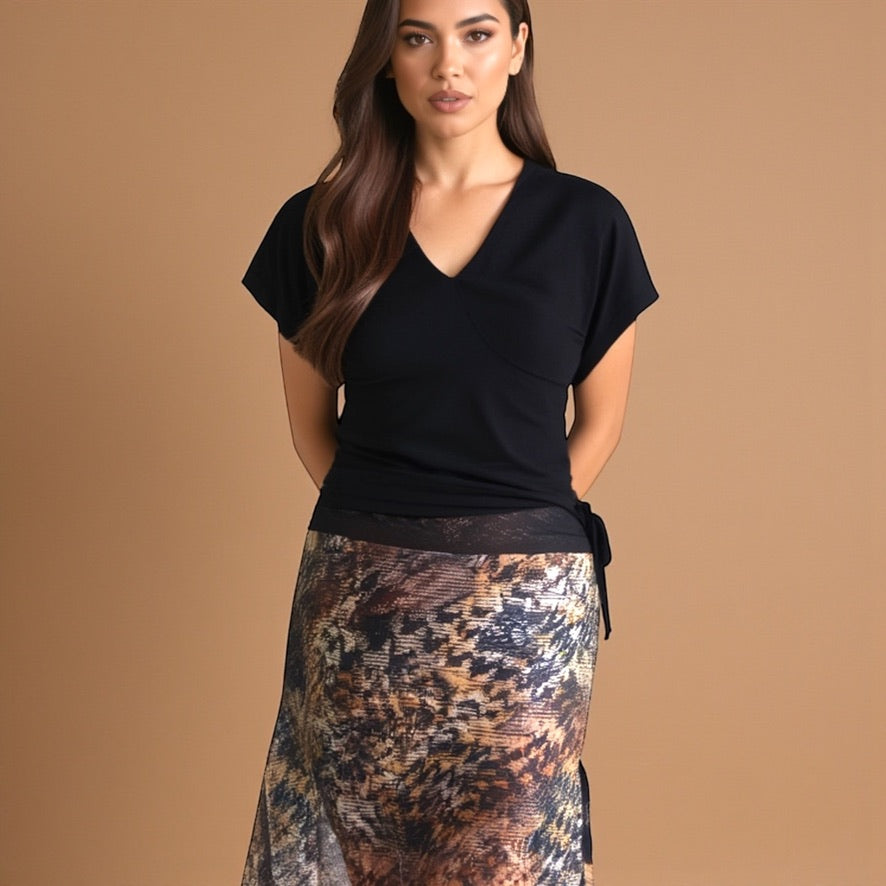 Dieser schmalsitzende Rock ist im Saum geschlitzt, sodass für die Bewegungsfreiheit beim Tanzen gesorgt ist. Genau im Verlauf zum Bund über dem Schlitz sorgt einen Tunnelzug für eine variable Raffung. Schlitz und Raffung können seitlich oder hinten getragen werden. Hierüber ergeben sich zahlreiche Styling-Möglichkeiten und wenn der Schlitz mittig hinten getragen wird, betont die Raffung den verlängerten Rücken auf eine Weise, wie es sie nur beim Tango gibt.