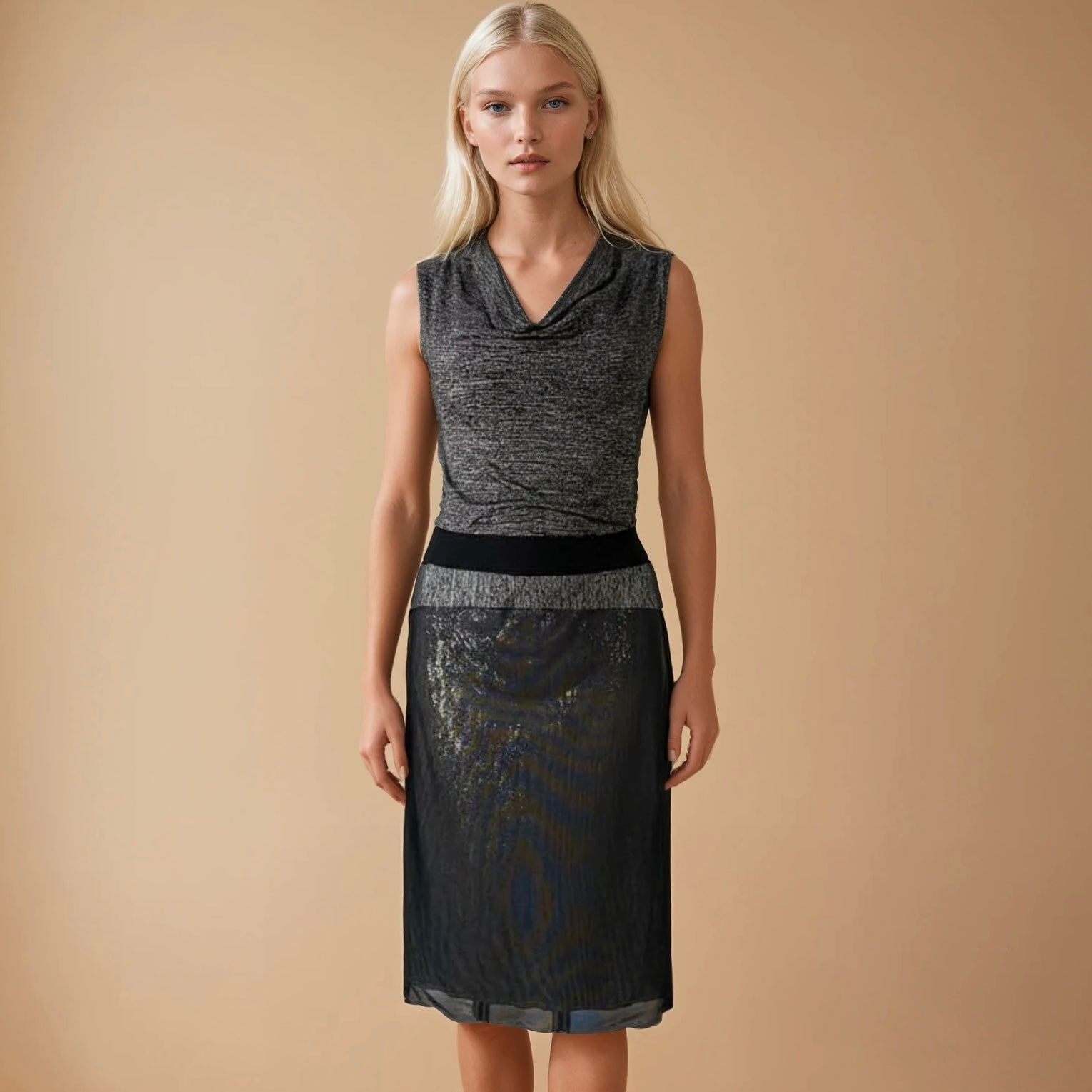 Dieser schmalsitzende Rock ist im Saum geschlitzt, sodass für die Bewegungsfreiheit beim Tanzen gesorgt ist. Genau im Verlauf zum Bund über dem Schlitz sorgt einen Tunnelzug für eine variable Raffung. Schlitz und Raffung können seitlich oder hinten getragen werden. Hierüber ergeben sich zahlreiche Styling-Möglichkeiten und wenn der Schlitz mittig hinten getragen wird, betont die Raffung den verlängerten Rücken auf eine Weise, wie es sie nur beim Tango gibt.