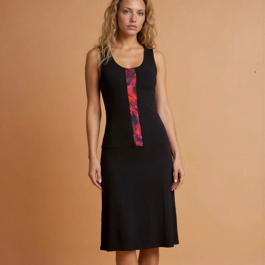 Das Kleid besticht durch sein klares, durchdachtes Design mit definierten Linien, die die Silhouette perfekt zur Geltung bringen. Der gefällige Rundhalsausschnitt vorn sorgt für ein dezent verführerisches Dekolleté, während die breiteren Träger einen BH problemlos verdecken und in ein gerade geschnittenes, etwas tiefer angesetztes Rückenteil übergehen – für optimalen Tragekomfort den ganzen Tag.