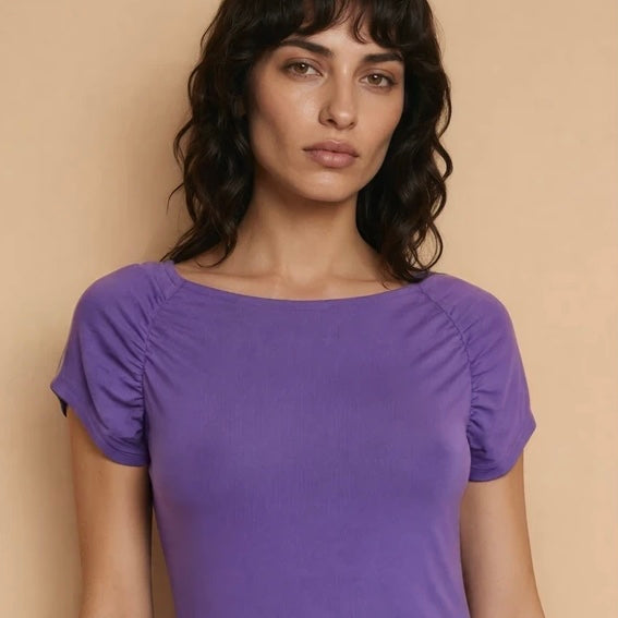 Feminin und sinnlich zugleich: Vom schmeichelhaften Carmen-Ausschnitt mit raffinierter Faltenlegung der Raglan-Ärmel fällt das Kleid eng anliegend in einen weiten Rockteil. Der Rückenausschnitt kann über einen Tunnelzug gerafft werden, so dass ein herzförmiger Blickfang entsteht.