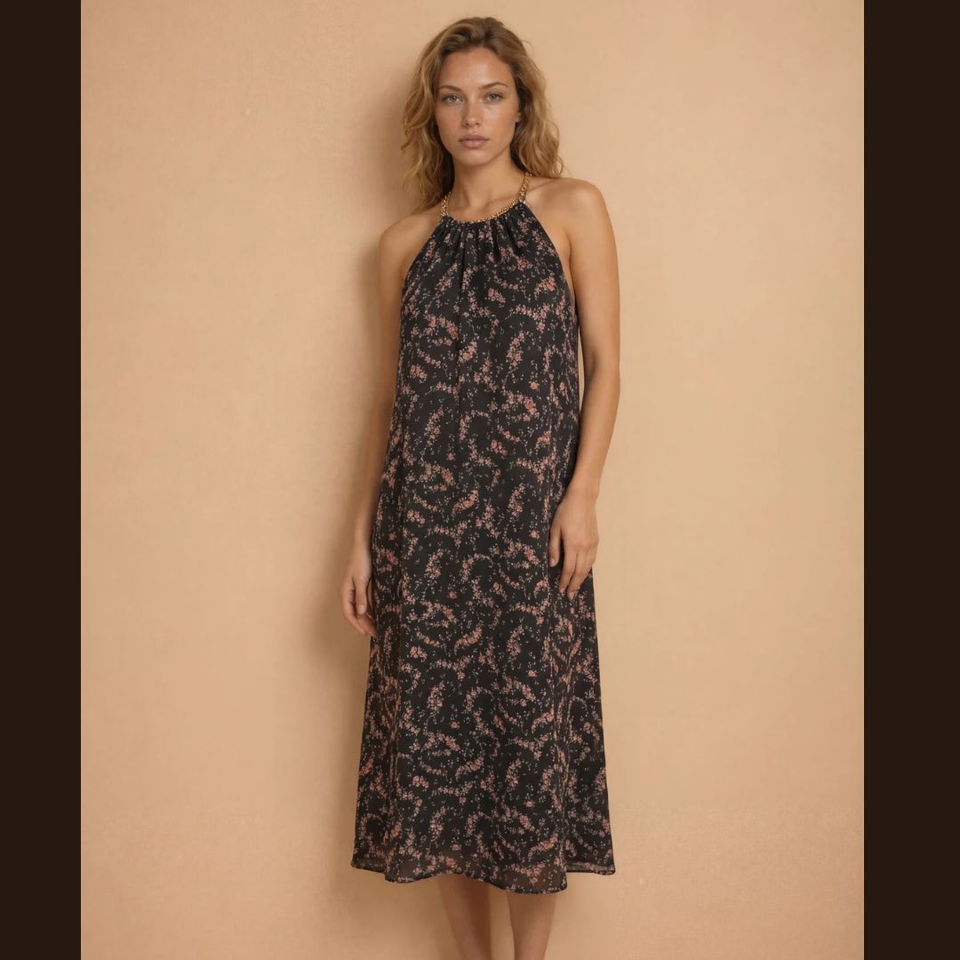 Das knieumspielende Halterneck-Kleid präsentiert sich von vorn zurückhaltend und schlicht. Doch wer hinter die Kulissen blickt, erlebt die Überraschung: Ein großzügiger Trapez-Rückenausschnitt setzt den Rücken gekonnt in Szene und sorgt für dramatische Momente bei jeder Drehung.