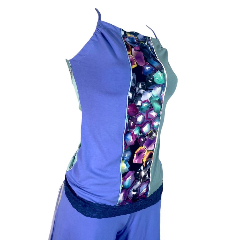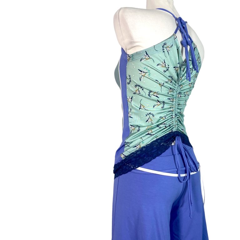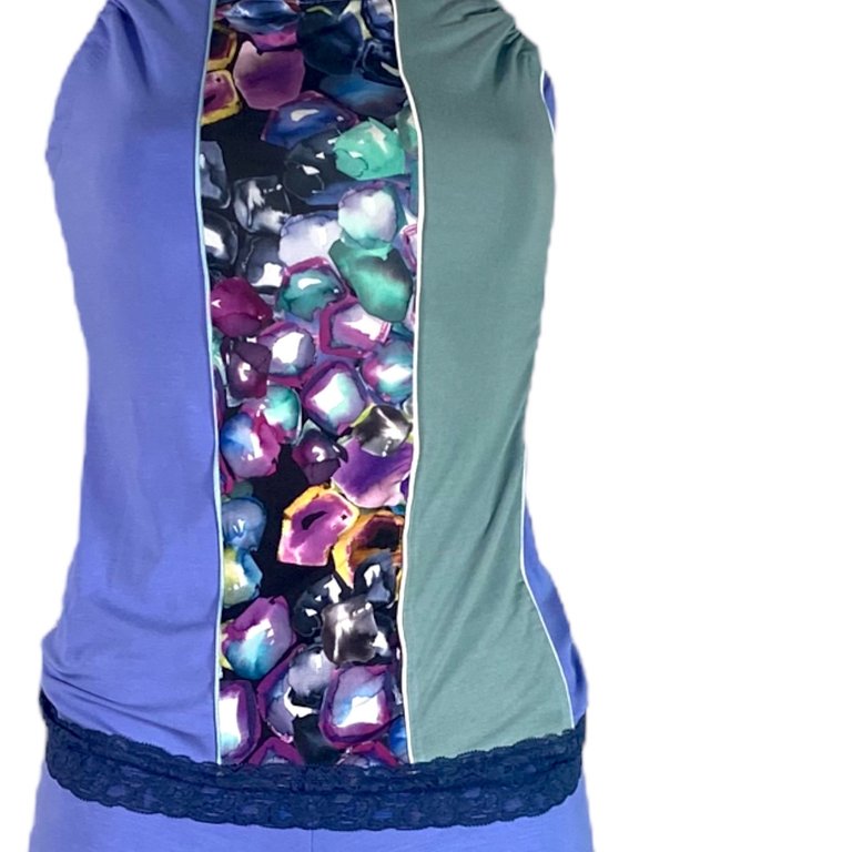 Im Armausschnitt befindet sich auf beiden Seiten ein Tunnelzug: So lässt sich das Tanztop mit Hilfe der Bindebändchen in der Höhe variieren, und man kann nach Belieben einen dezenteren oder auch tieferen Ausschnitt zaubern.