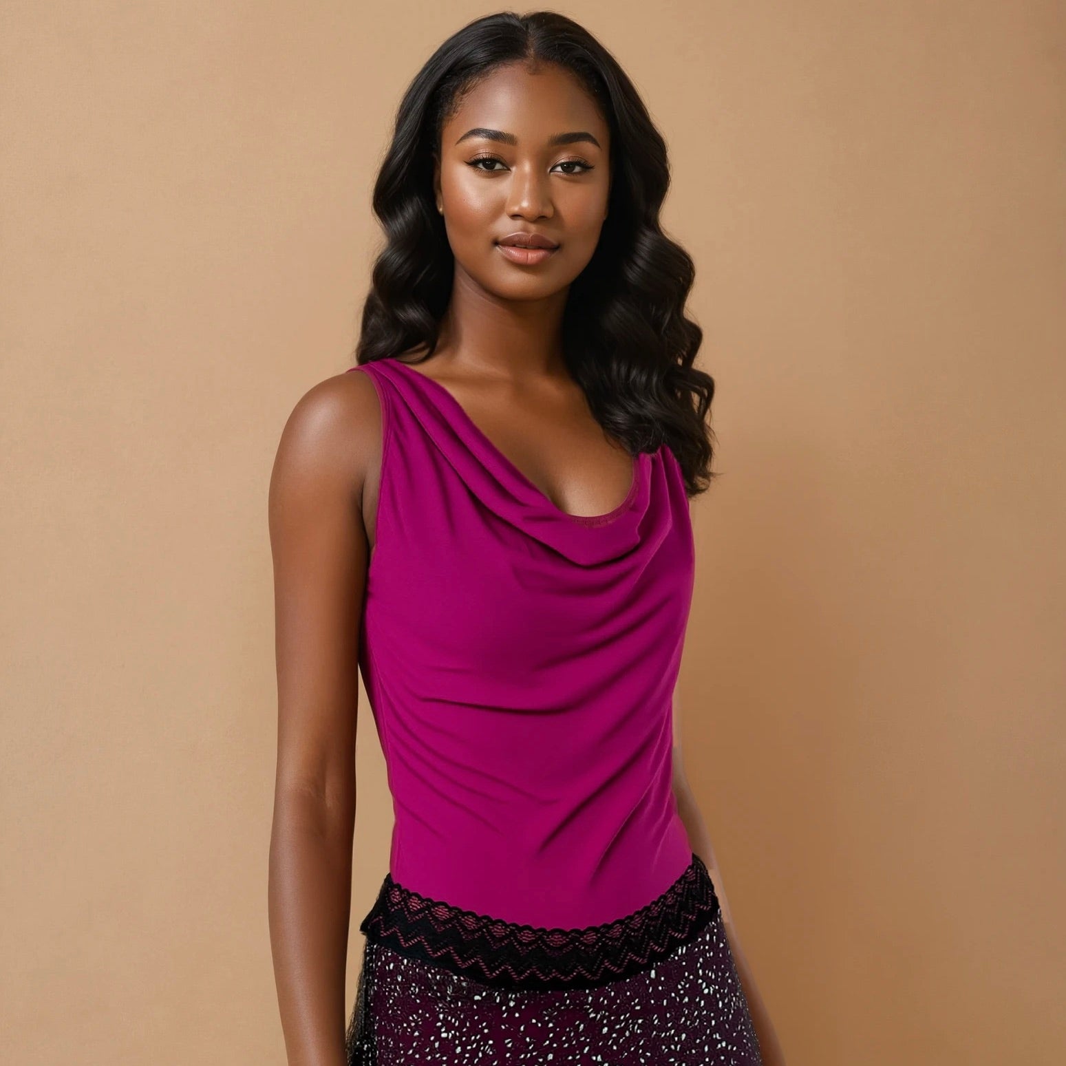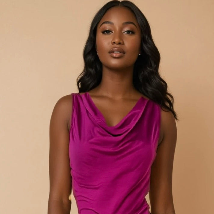 Sowohl vorn als auch hinten bezaubert es mit seinem hübschen Wasserfallkragen. Auf den Schultern liegt der Stoff handbreit, so dass BH-Träger ideal verdeckt werden. Als kleines graziles Detail verläuft über dem Rückenausschnitt, in etwa auf Nackenhöhe, ein Zierbändchen, das für perfekten Sitz des Oberteils sorgt.