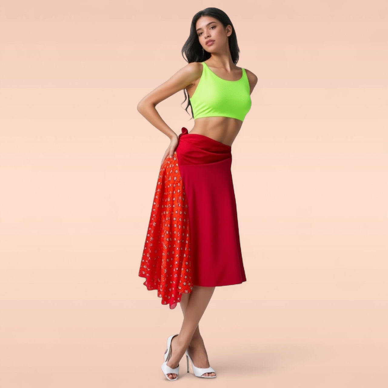An der kürzesten Seite ist der Milongarock ca. 52 cm lang (Bund bis Saum), an der längsten Seite ca. 68 cm (Bund bis Godet-Spitze).